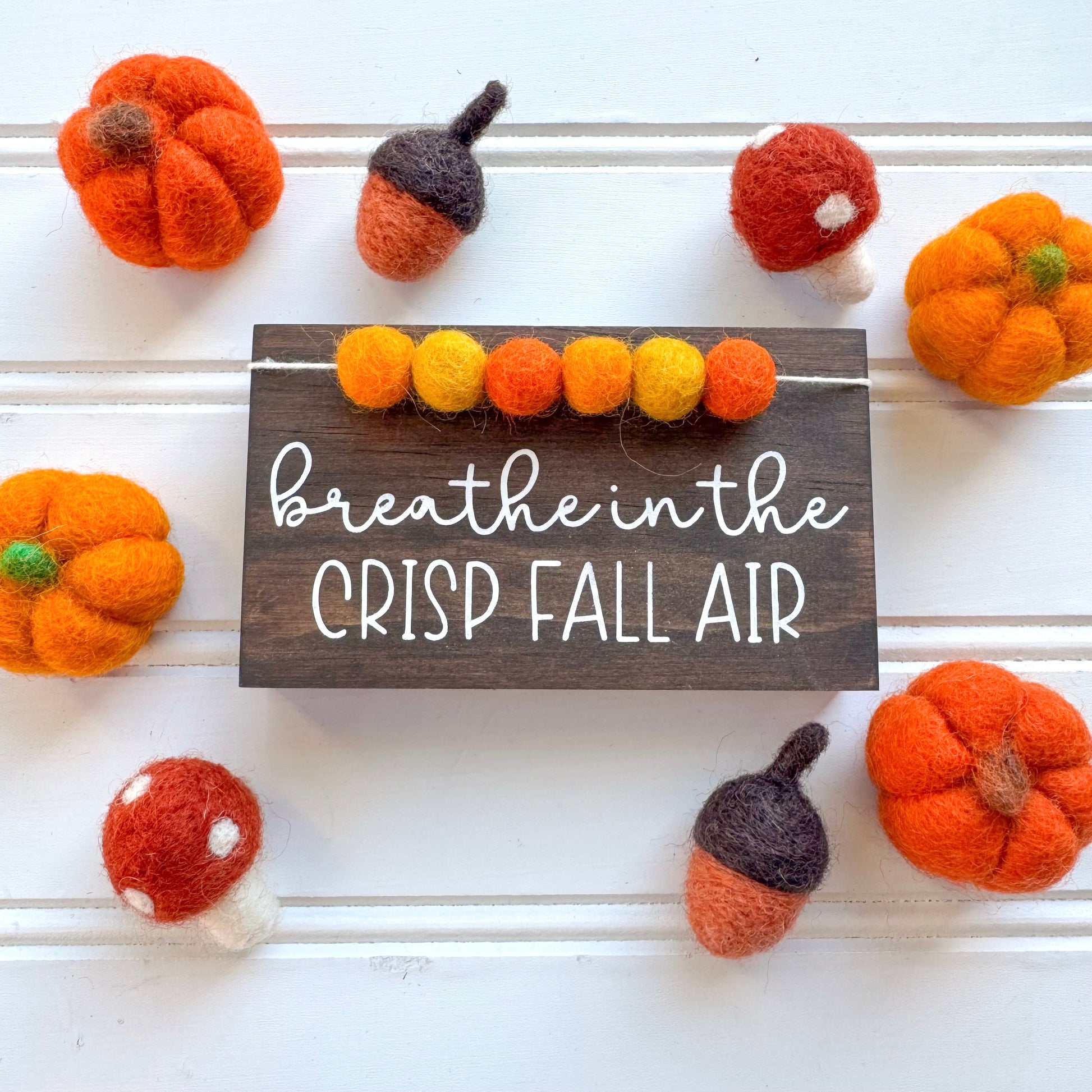 features a stained base, white painted lettering and an attached mini felt ball garland in dark orange, orange, and mustard.