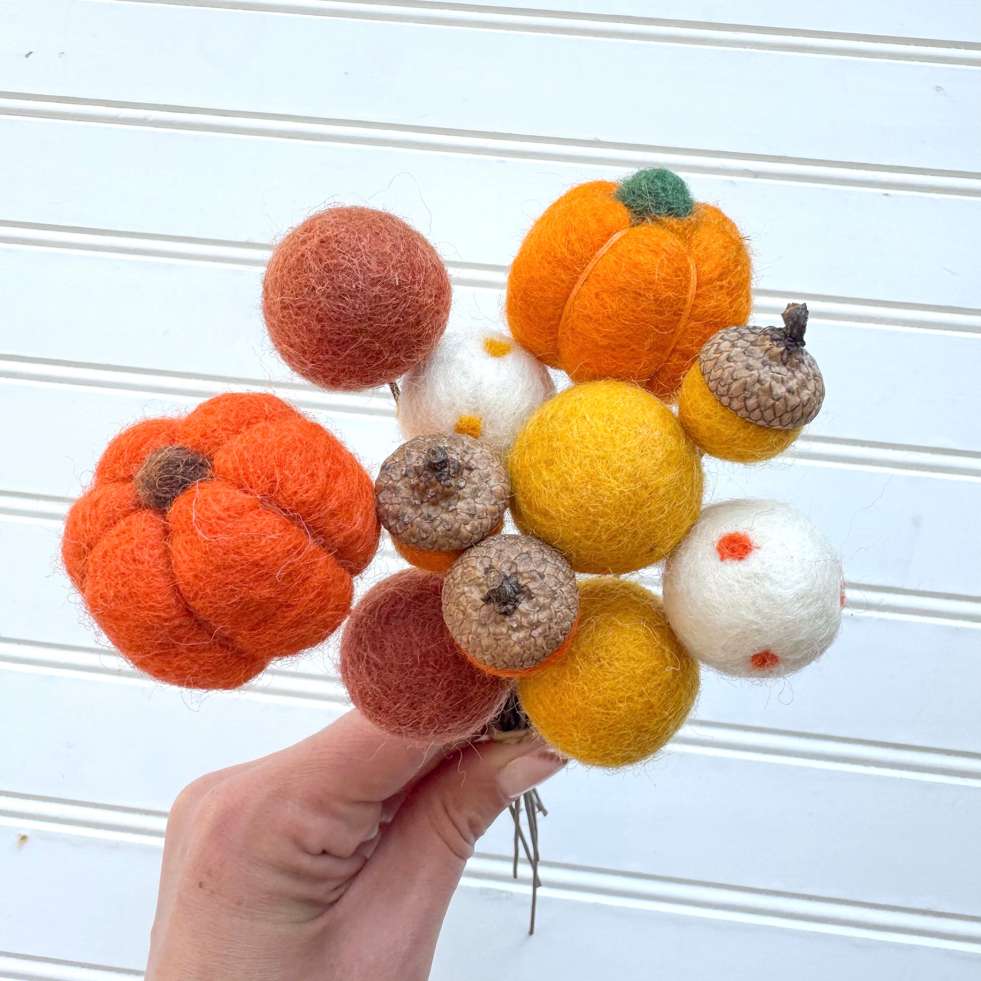 Each bouquet features 2 felted pumpkins, 3 felt ball acorns with natural caps, and 6 large felt balls, as shown. All felted items are 100% wool.