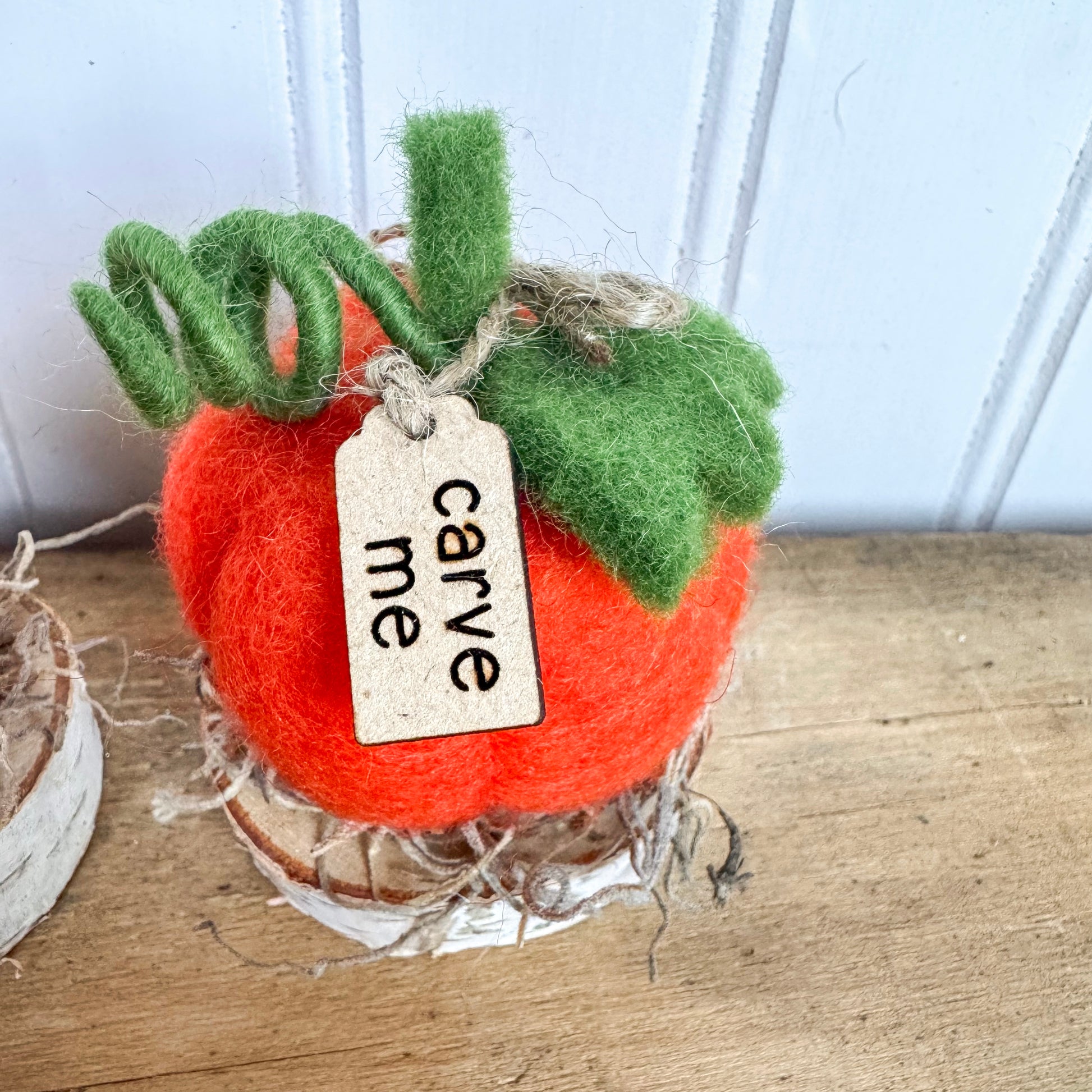 These pumpkins features a large bright orange pumpkin witgh felt leave and vine accent and a handmade mini wood tag. Pumpkin is perched on a natural wood slice with moss.